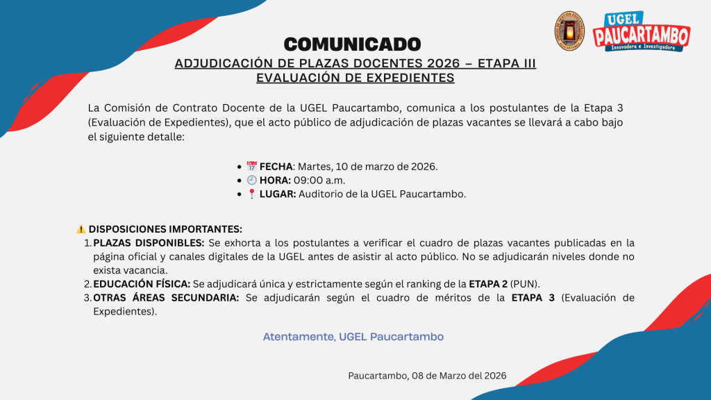 ADJUDICACIÓN DE PLAZAS – CONTRATA DOCENTE ETAPA 2 Y ETAPA 3 Mar 8, 2026 UGEL PAUCARTAMBO 2584 Views Share on Facebook Twitter Linkedin Pinterest