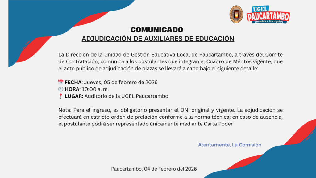 ADJUDICACIÓN – PLAZAS VACANTES DE AUXILIARES DE EDUCACIÓN Feb 4, 2026 UGEL PAUCARTAMBO 2227 Views Share on Facebook Twitter Linkedin Pinterest