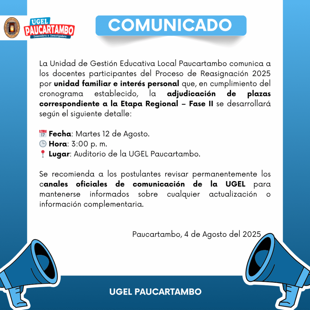 COMUNICADO – ADJUDICACIÓN REASIGNACIÓN ETAPA REGIONAL FASE II Ago 4, 2025 UGEL PAUCARTAMBO 613 Views Share on Facebook Twitter Linkedin