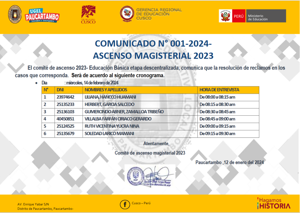 COMUNICADO Nº 001-2024 «ASCENSO MAGISTERIAL 2023» Feb 12, 2024 UGEL PAUCARTAMBO 1121 Views Share on Facebook Twitter Linkedin Pinterest