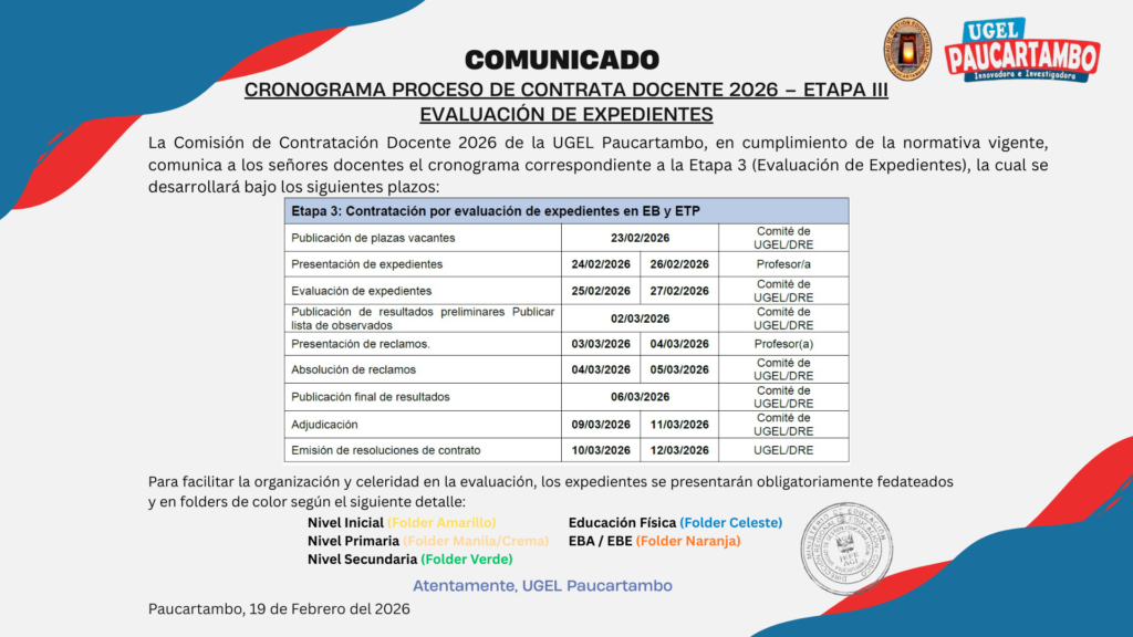 CRONOGRAMA ETAPA 3 CONTRATA DOCENTE – EVALUACIÓN DE EXPEDIENTES Feb 19, 2026 UGEL PAUCARTAMBO 4109 Views Share on Facebook Twitter Linkedin Pinterest
