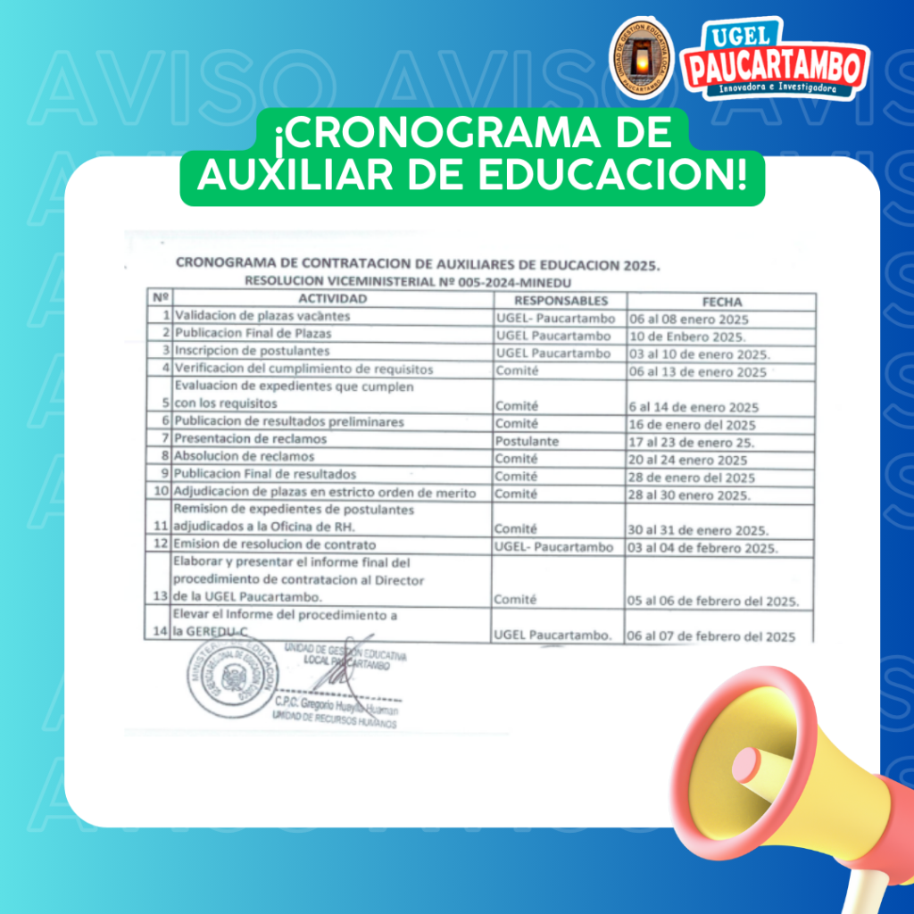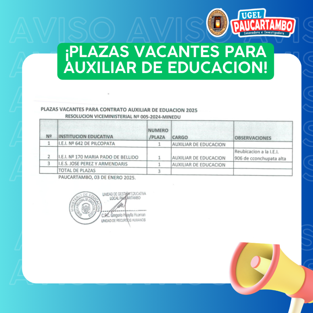 CRONOGRAMA Y PLAZAS PARA AUXILIAR DOCENTE Ene 6, 2025 UGEL PAUCARTAMBO 1533 Views Share on Facebook Twitter Linkedin Pinterest