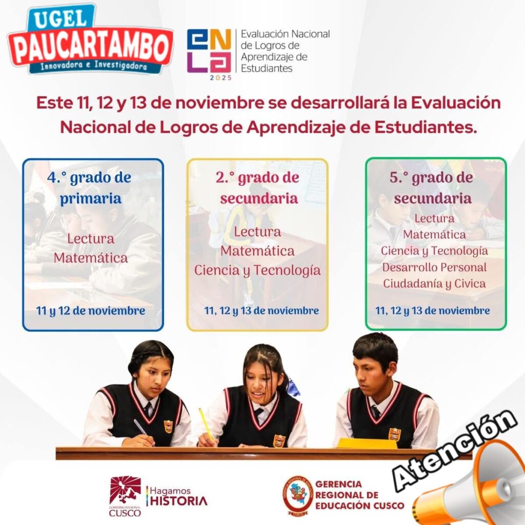 Buen dia estimados directores y docentes. Les remito el video de apoyo y motivación para la aplicación de la ENLA para compartir a través de ustedes a los docentes de sus IIEE donde se aplicará la prueba ENLA. Tenemos 3 tareas en esta movilización Local para los días 11, 12 y 13 de noviembre: – Sensibilizar a los Padres de Familia para que envien con puntualidad a sus hijos para su evaluación. – Recordar a los docentes, que deben crear las condiciones y facilidades para la aplicación de la prueba en la fecha y hora correspondiente. – A los estudiantes, responder y resolver la totalidad de preguntas en el tiempo asignado dandole la debida importancia a esta evaluación. Gracias por compartir la información a sus docentes. Tengan un lindo domingo y disculpen por enviar el mensaje en dia de descanso