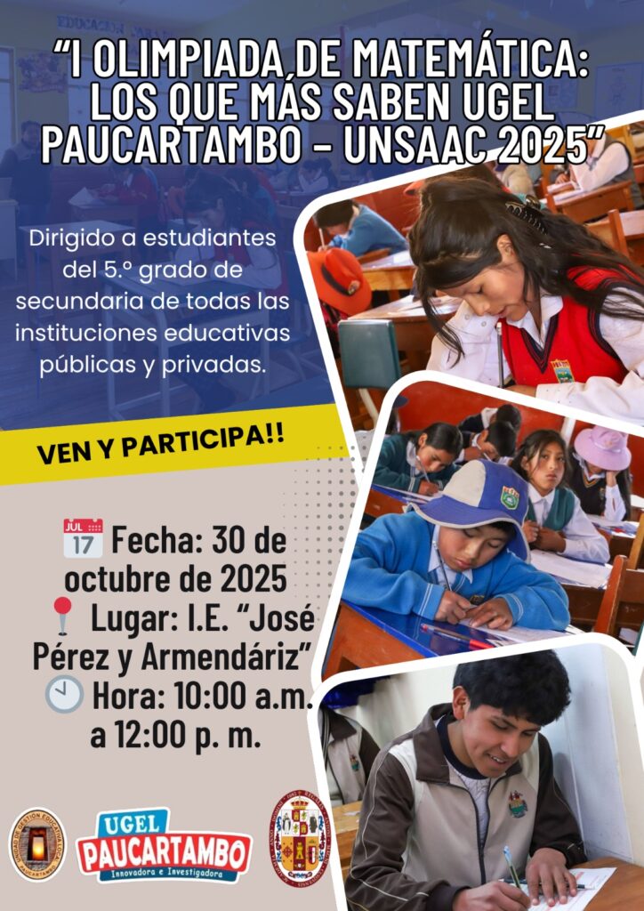 La Unidad de Gestión Educativa Local de Paucartambo invita a los estudiantes del 5.º grado de educación secundaria de todas las instituciones educativas públicas y privadas de la provincia a participar en el Concurso de Conocimientos en el área de Matemática.