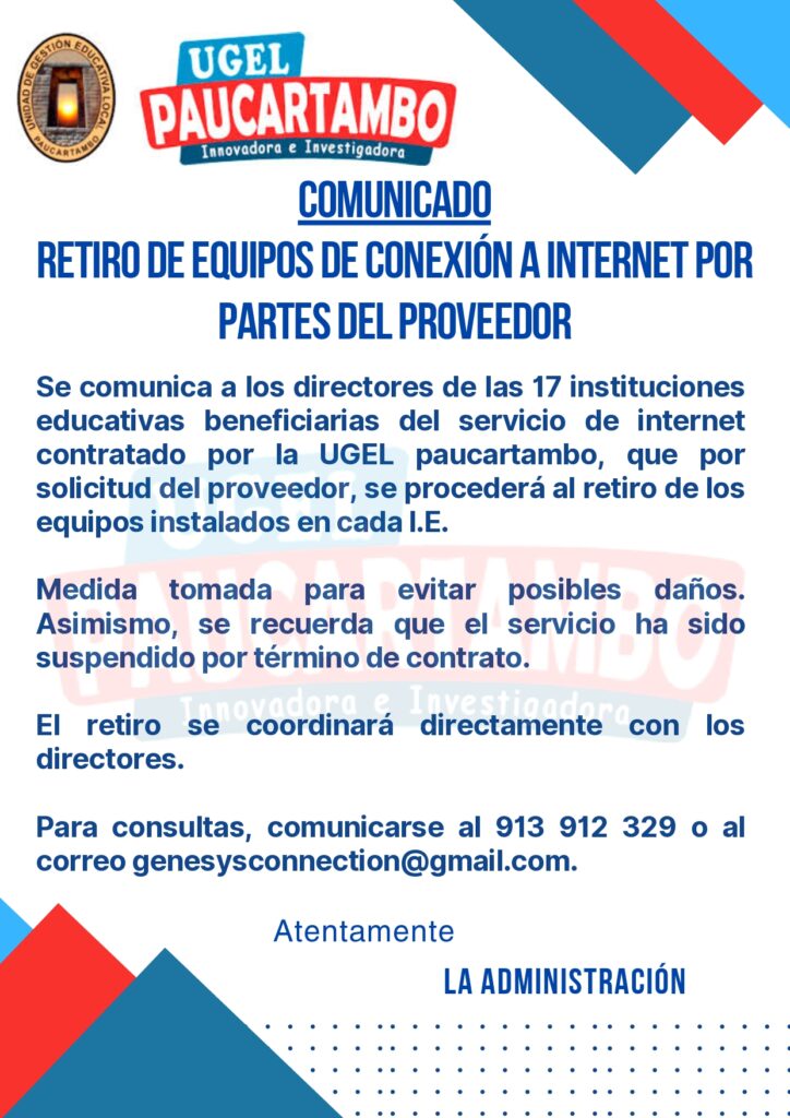 RETIRO DE EQUIPOS DE CONEXIÓN A INTERNET PORPARTES DEL PROVEEDOR Sep 2, 2025 UGEL PAUCARTAMBO 334 Views Share on Facebook Twitter Linkedin